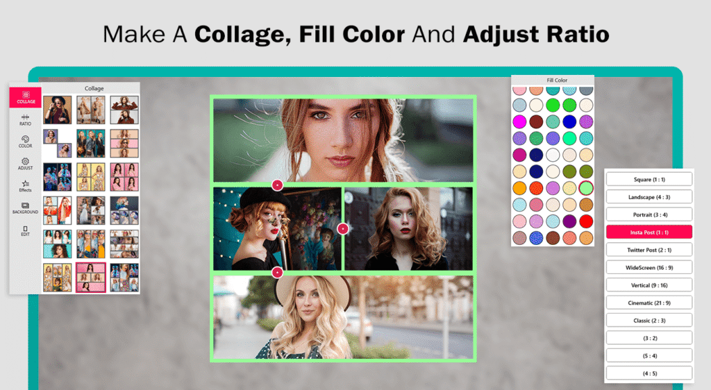 - The ‘Ratio‘ button allows you to select your preferred social media collage ratio. The app provides a variety of social media collage ratios to choose from.