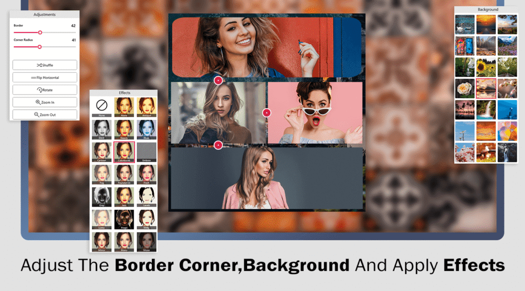 - After changing the border color on your collage, click on the ‘Adjust‘ button to fine-tune the border and corner radius. You can also shuffle collage images, flip, rotate, and explore many more customization options.